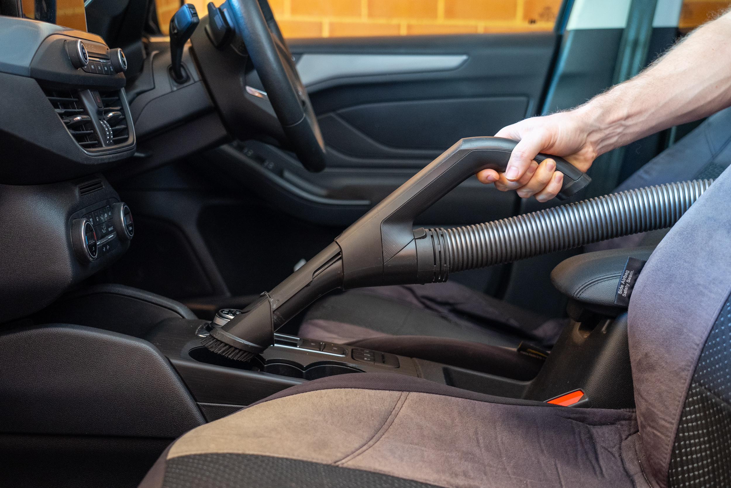 This starts with a simple vacuum and removal of any rubbish or items that don’t have a home in your car. Once all the loose dirt is gone, you can move onto embedded dirt and stains with a cleaning and protectant spray. Soak a new microfibre towel in this and wipe over any plastic or vinyl surfaces, using a bit of elbow grease to free up stains where necessary. Avoid using this on any control surfaces such as gear levers, steering wheel, handbrake and pedals. For tight and tricky areas, you can spray some on a detailing brush to get in deep.